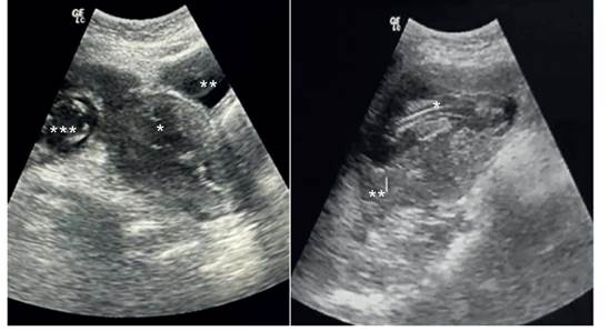 Figura 1 a. ecografía obstétrica que muestra útero vacuo (*) junto a la vejiga (**) y cráneo del feto (***). b. feto (*) y placenta (**) sin miometrio circundante.