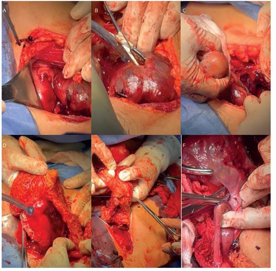 Se llevó a cabo una laparotomía exploratoria mediante incisión suprapúbica transversa, revelando un hemoperitoneo de 500 mL. Durante la exploración quirúrgica, se identificó una masa plastronada suprauterina medial, compatible con el capullo corioamniótico de 15 cm (figuras 2A, 2B), de la cual se extrajo un feto sin actividad cardiaca de aproximadamente 14 semanas (figura 2C). Además, se llevó a cabo la liberación del epiplón comprometido y la exéresis de la masa peritoneal que contenía placenta y membrana ovulares (figuras 2D, 2E,). El compromiso placentario se limitó al epiplón y a la trompa derecha (figura 2F), logrando preservar el útero y el anexo contralateral.