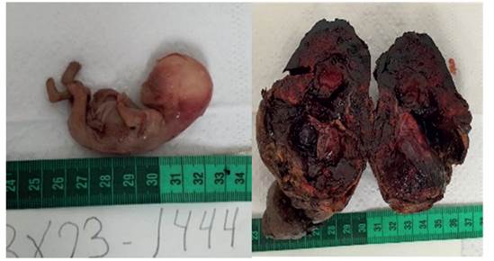 Figura 3 estudio macroscópico: a. feto sin actividad cardiaca de aproximadamente 14 semanas extraído del capullo corioamniótico. b. capullo corioamniótico.