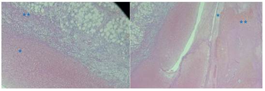 Figura 4 estudio anatomopatológico: a vista de la inserción de tejido trofoblástico (*) en el tejido graso epiploico (**). b. tejido graso del epiplón (*), donde se halló tejido placentario (**).