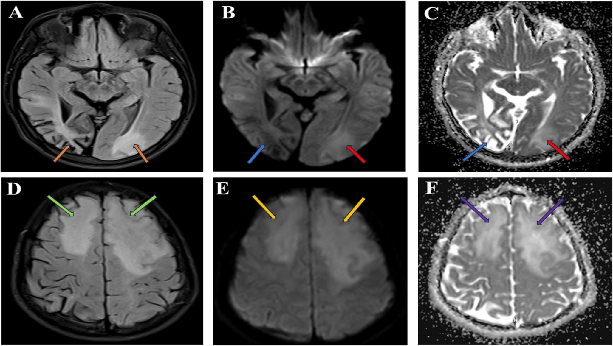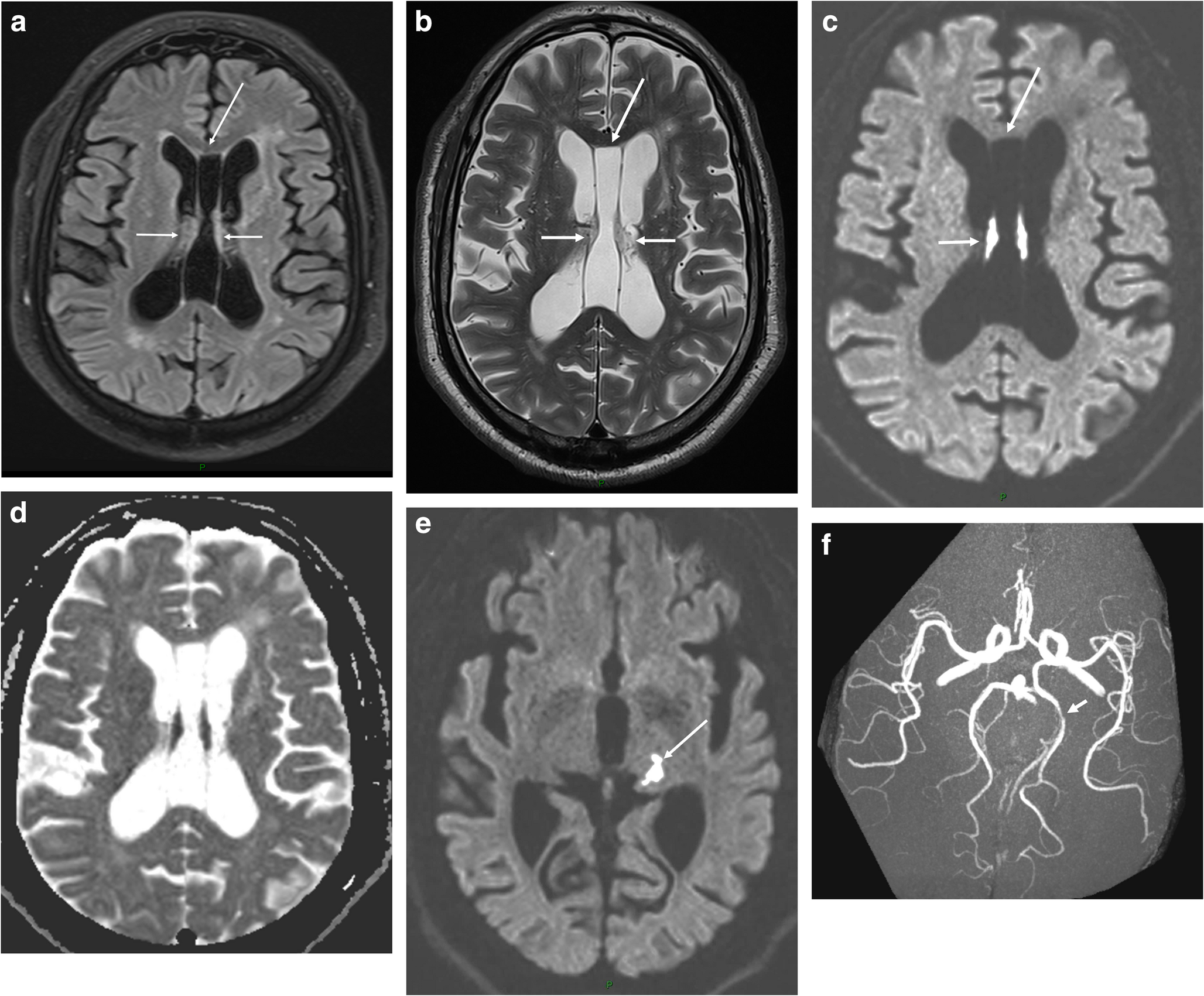 Purpose: Bilateral damage of fornix bodies has been reported in a few cases of brain tumors and in exceptional cases of ischemia. Methods: a 73-year-old man presented with acute right ataxic hemiparesis and right hypoesthesia. Brain MRI showed an acute ischemia of both fornix bodies and of the left posterior lateral thalamus, along with a septum pellucidum (SP) cyst. MR angiography revealed a 7-mm long stenosis of the initial P2 of the left posterior cerebral artery. Neuropsychological evaluation documented an amnestic syndrome. Fornix bodies and posterolateral thalamus are supplied by the medial and lateral branches of posterior choroidal artery, arising from the initial P2. As our patient presented a single intracranial vascular lesion on MR-angiography, i.e. long stenosis at the initial P2, left thalamic ischemia and ischemic lesions of both fornix bodies were due to the unpaired variation of that artery. Moreover, this fornix ischemia occurred in association with SP cyst, which did not favored the ischemia, but resulted in a unique and unreported pattern, because of the configuration and relationships of the fornix. The amnestic syndrome related to the fornix ischemia in our patient was non-specific. Conclusions: unreported condition of infarct of both the fornix bodies- responsible for acute anterograde amnesia- and of left inferolateral and posterior thalamic territories, related to an atheromatous stenosis of the initial left P2 posterior cerebral artery. The fornix bodies infarct occurred in a patient with a large SP cyst, which gives a particular pattern, non-previously described.